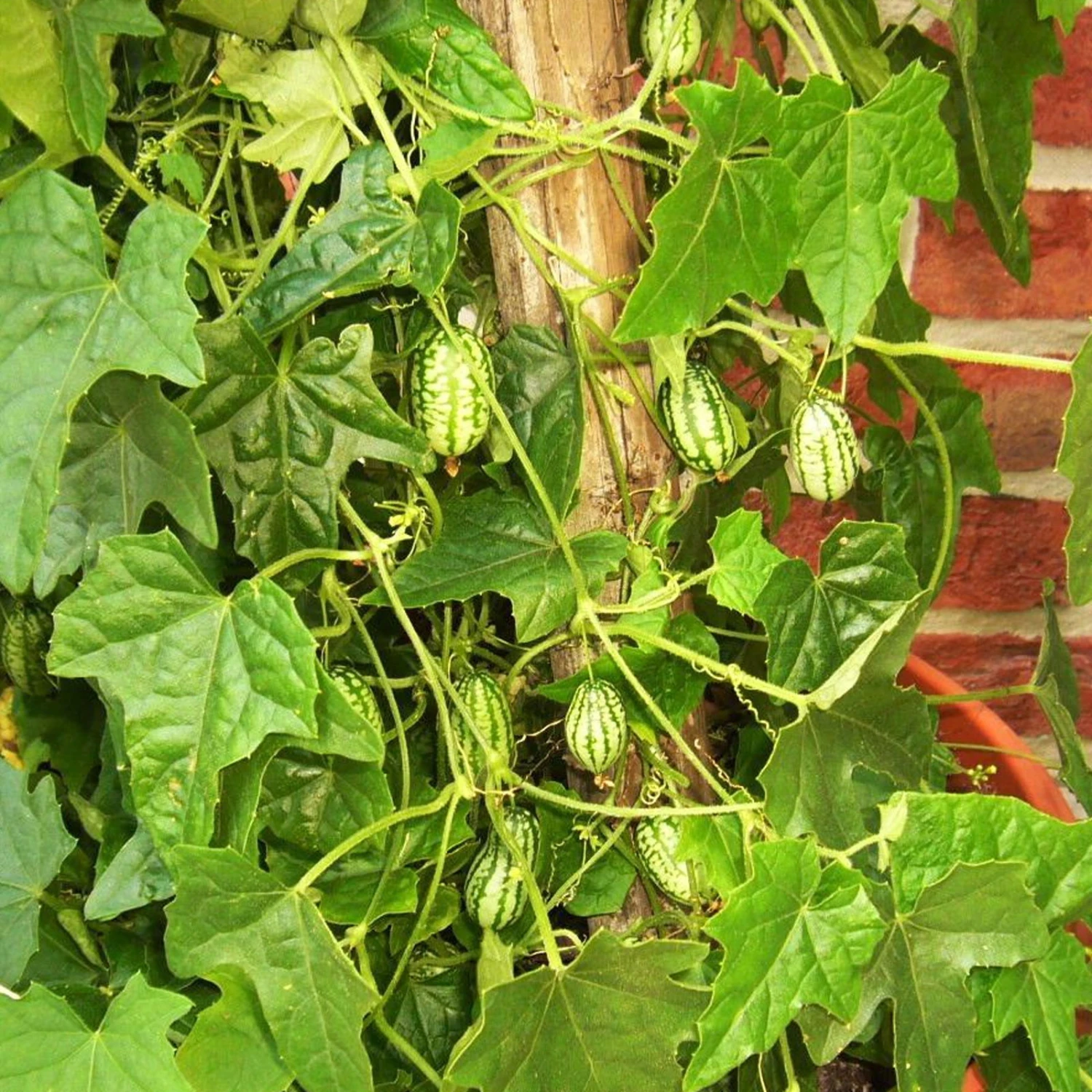 Die 2-3 cm großen Früchte der Mexikanischen Minigurke sehen aus wie eine Mini-Wassermelone, haben aber den Geschmack einer Gurke. und reifen den ganzen Sommer über. Sie eignen sich zum Naschen dirket von der Pflanze, als Snack oder im Salat.