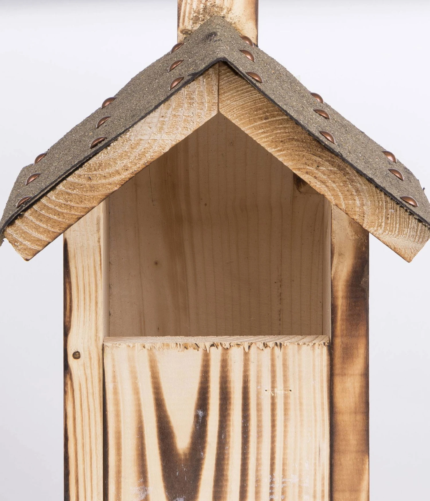 Der hochwertige Nistkasten wurde aus naturbelassenem Fichtenholz gefertigt und mit einem Dach aus Dachpappe versehen.