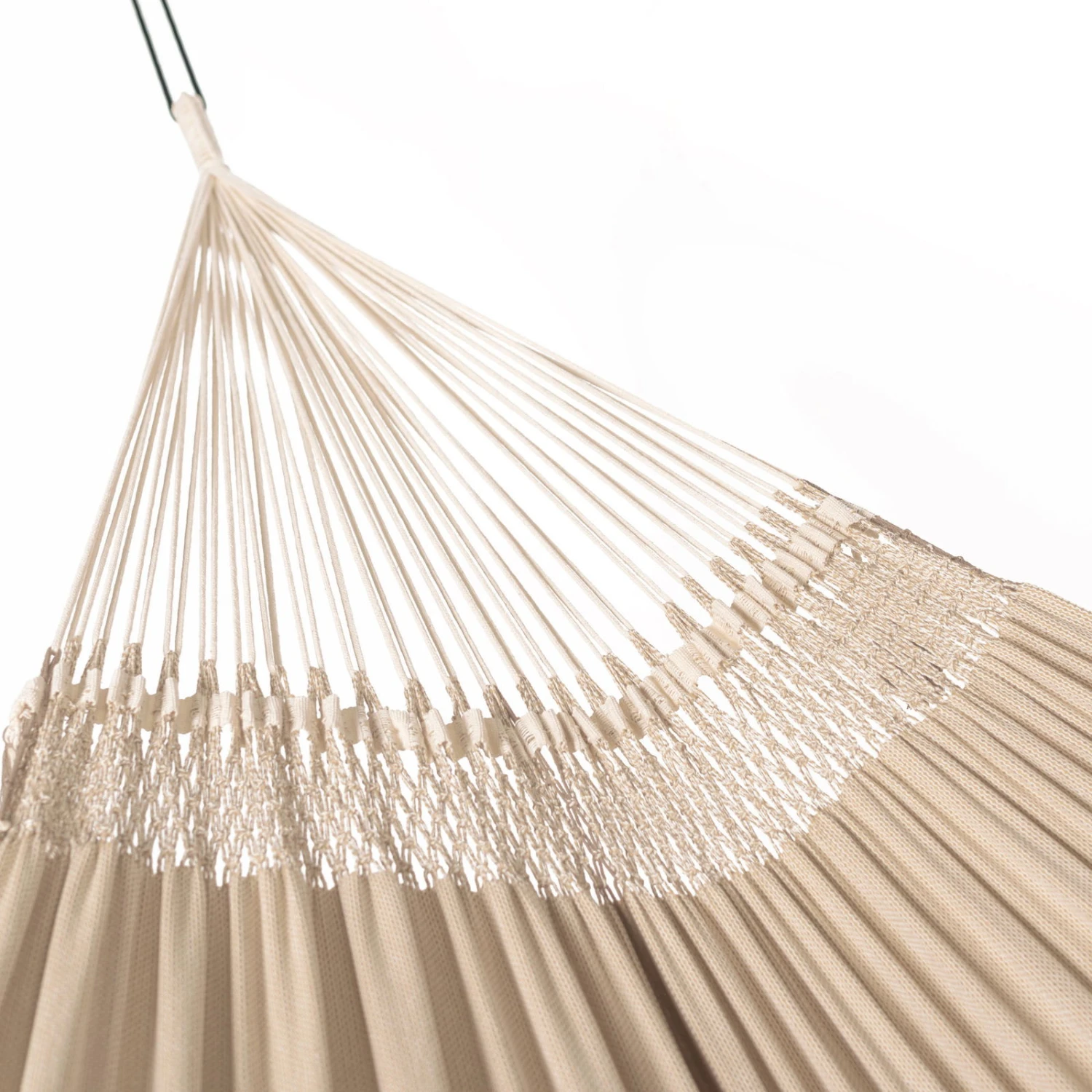 Mit einer komfortablen Größe von 180 x 400 x 180 cm ist die beigefarbene Kingsize Hängematte ‚Bossanova‘ ein idealer Erholungsort für die ganze Familie. Sie ist aus Bio-Baumwolle gefertigt und mit reißfesten Webkanten versehen. Deshalb hat sie eine hohe Belastbarkeit von 200 kg. Freuen Sie sich auf entspannende Stunden!