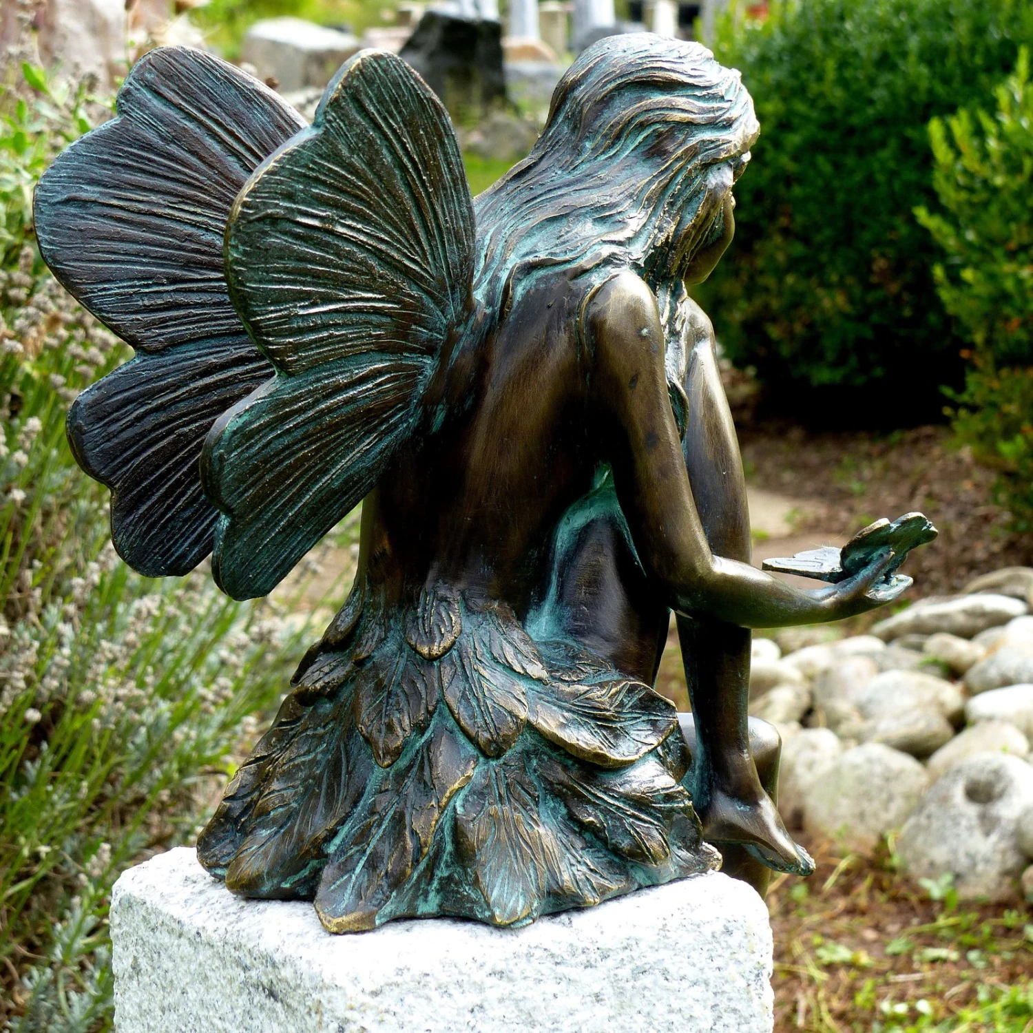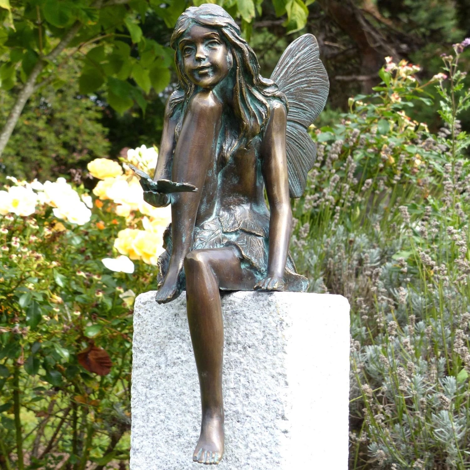 Die Bronze-Skulptur ‚Fee sitzend mit Schmetterling‘ von Rottenecker ist ein charmanter Blickfang für Ihren Garten oder Ihre Terrasse. Diese Figur wurde in Handarbeit in Deutschland gefertigt und begeistert durch anmutiges, filigranes Design. Dabei ist der Bronzeguss pflegeleicht, frosthart und langlebig.
