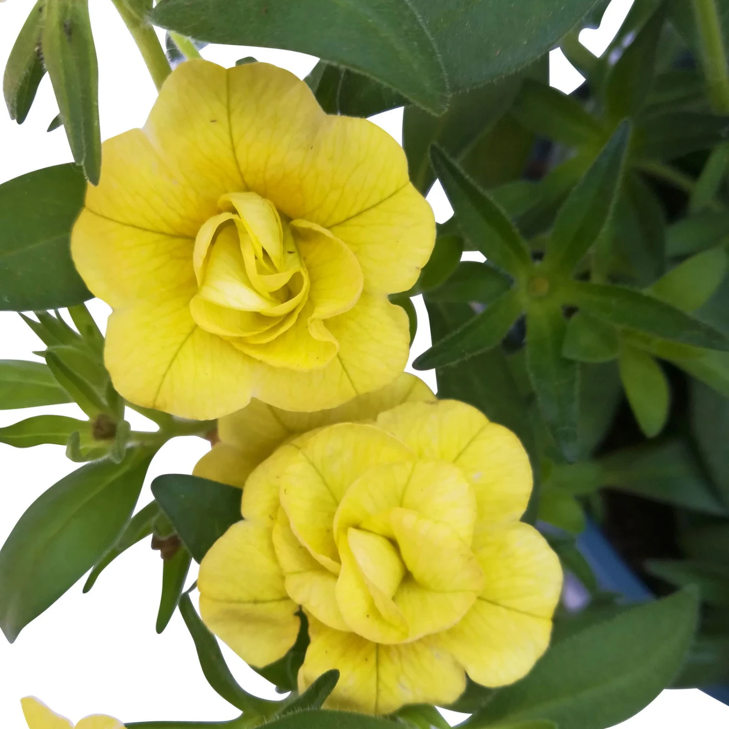 Die elliptischen und leicht klebrigen Blätter der Zauberglöckchen (Calibrachoa Hybride ‚MiniFamous® Neo Double Lemon‘) begeistern mit ihrem kräftigen Grün. Das Zauberglöckchen wächst in Kasten, Kübel oder Ampel kompakt bis überhängend. Auf dem Beet oder Grab ausgepflanzt, ist es bodendeckend. Die Zauberglöckchen zählen zu den Nachtschattengewächsen. Die bei uns einjährige Sommerblume kann eine Wuchslänge von ca. 50 cm erreichen.